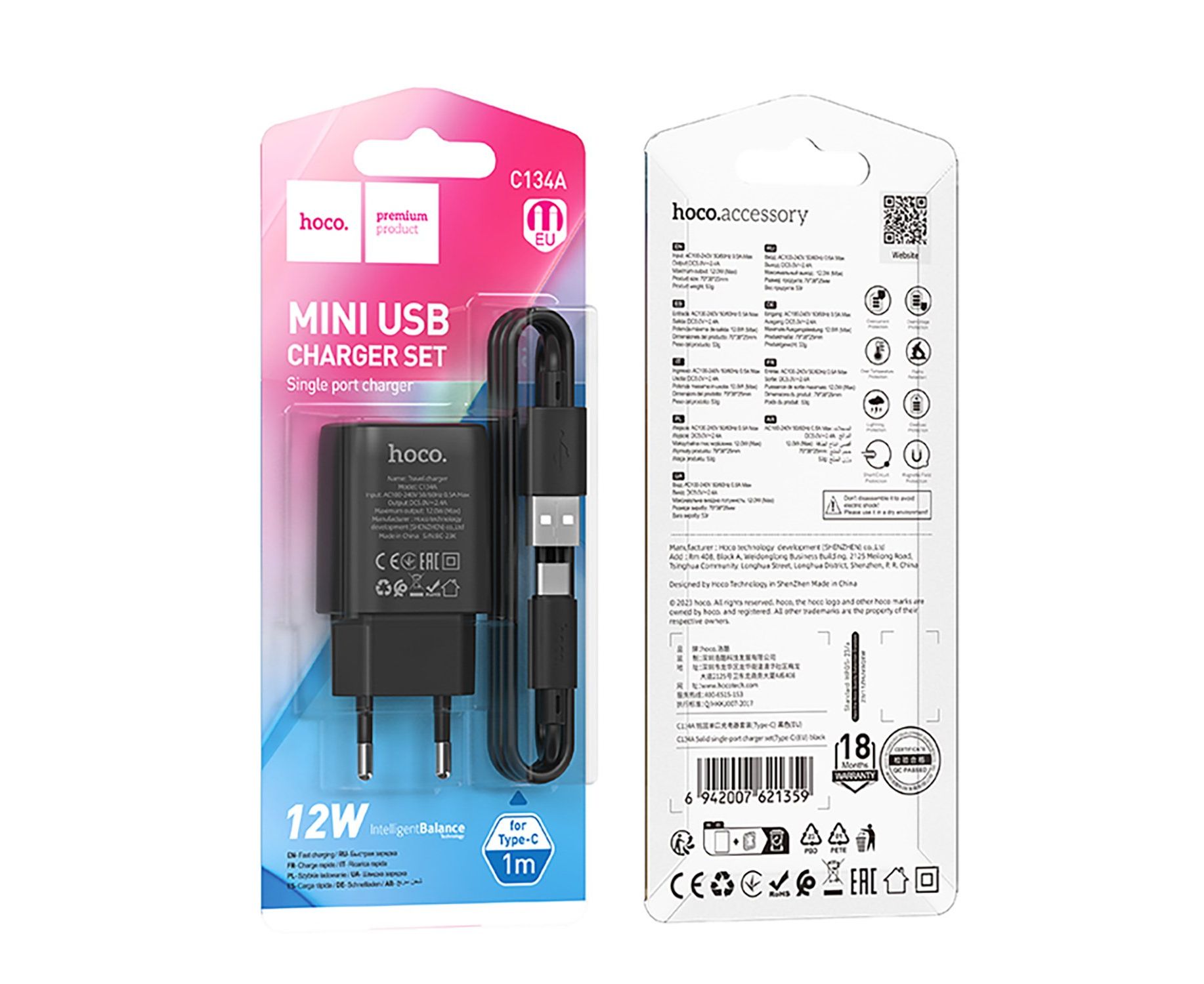 Адаптер Сетевой с кабелем Hoco C134A Solid USB 2,4A/12W (USB/Type-C) (black) (240263)