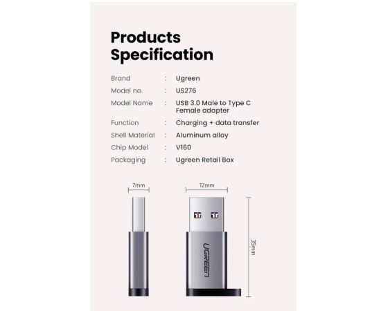 Адаптер UGreen US276 (50533) USB 3.0-A to USB-C M/F Adpater серый