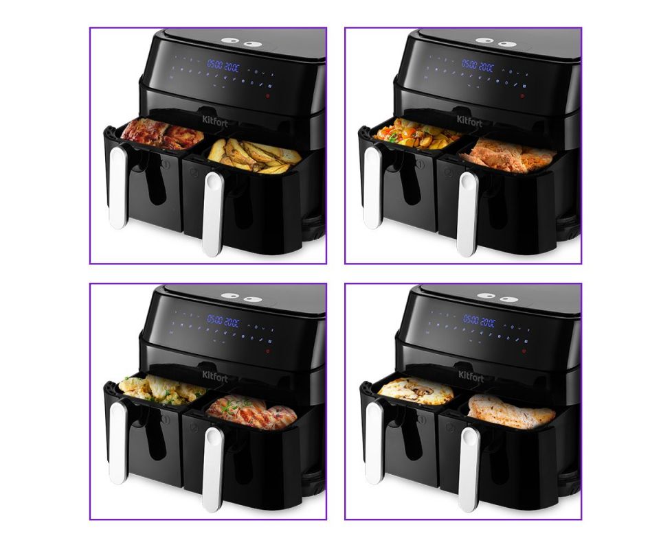 Функциональный аэрогриль КТ-2250 может использоваться как аэрогриль, аэрофритюрница, а также как духовка. Позволяет готовить несколько блюд одновременно с минимальным количеством масла или вовсе без его добавления!