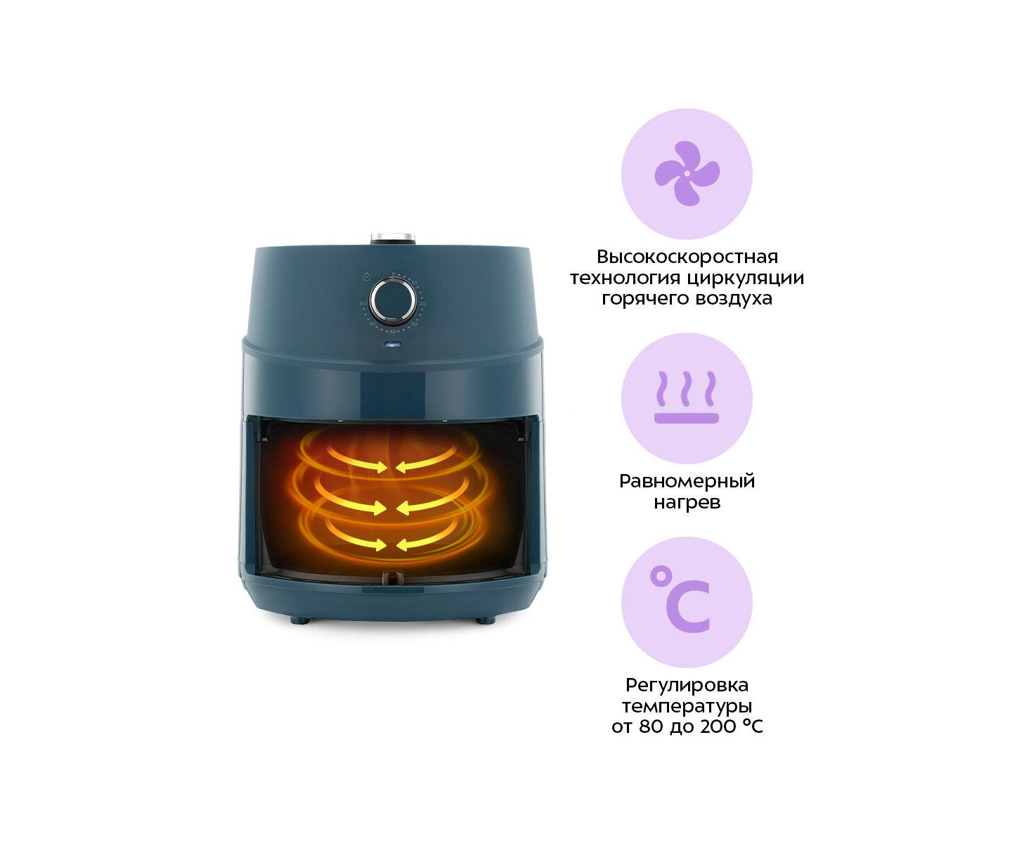 При помощи системы циркуляции горячего воздуха продукты равномерно обжариваются со всех сторон и получаются нежными внутри и хорошо запечёнными снаружи. Продукты практически не пригорают, а сам процесс готовки не требует постоянного присутствия на кухне.