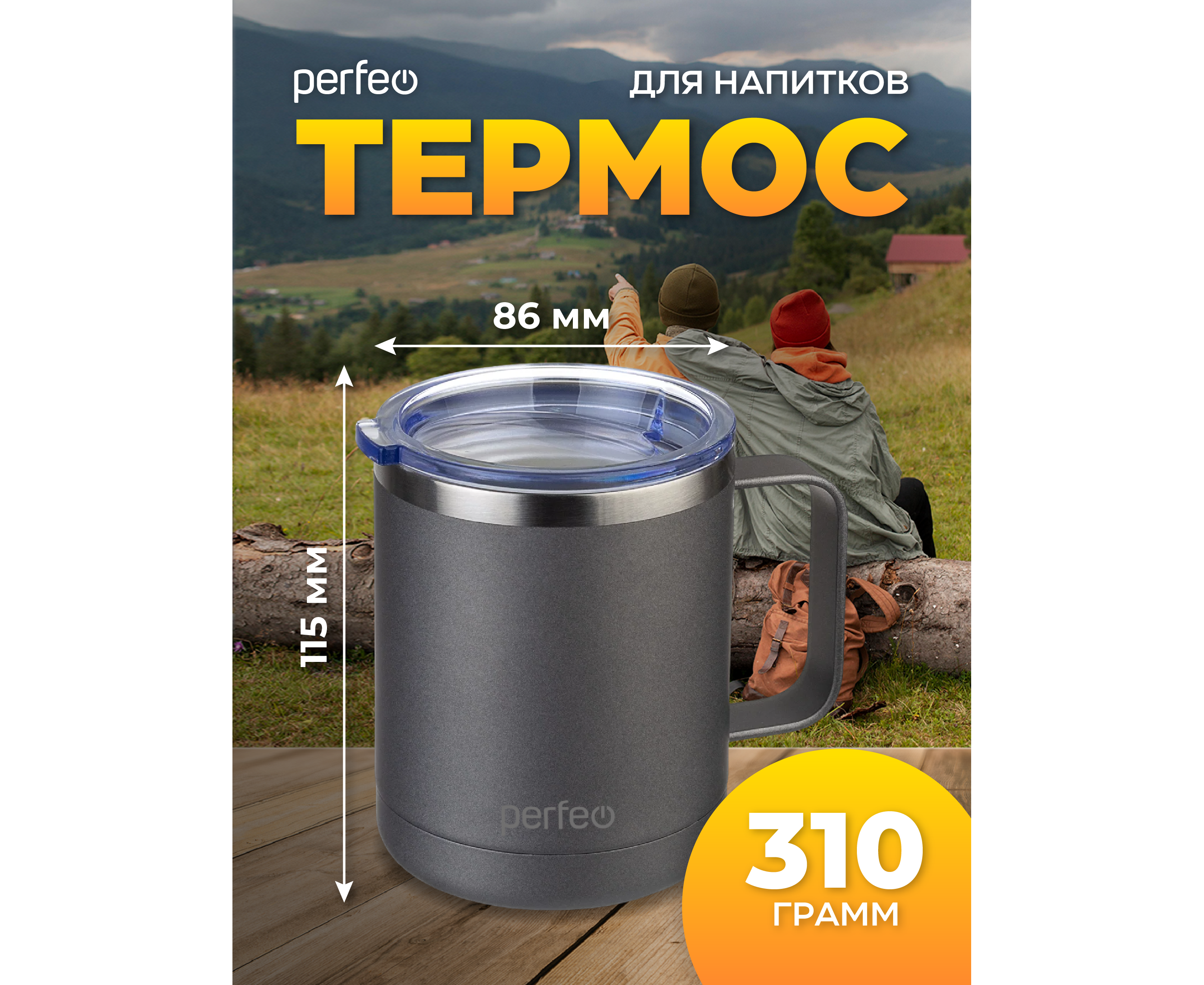 Акция !!! Термокружка для напитков PERFEO с прозрачной крышкой, ручкой, объем 0,35 л., серый (PF_C3731)