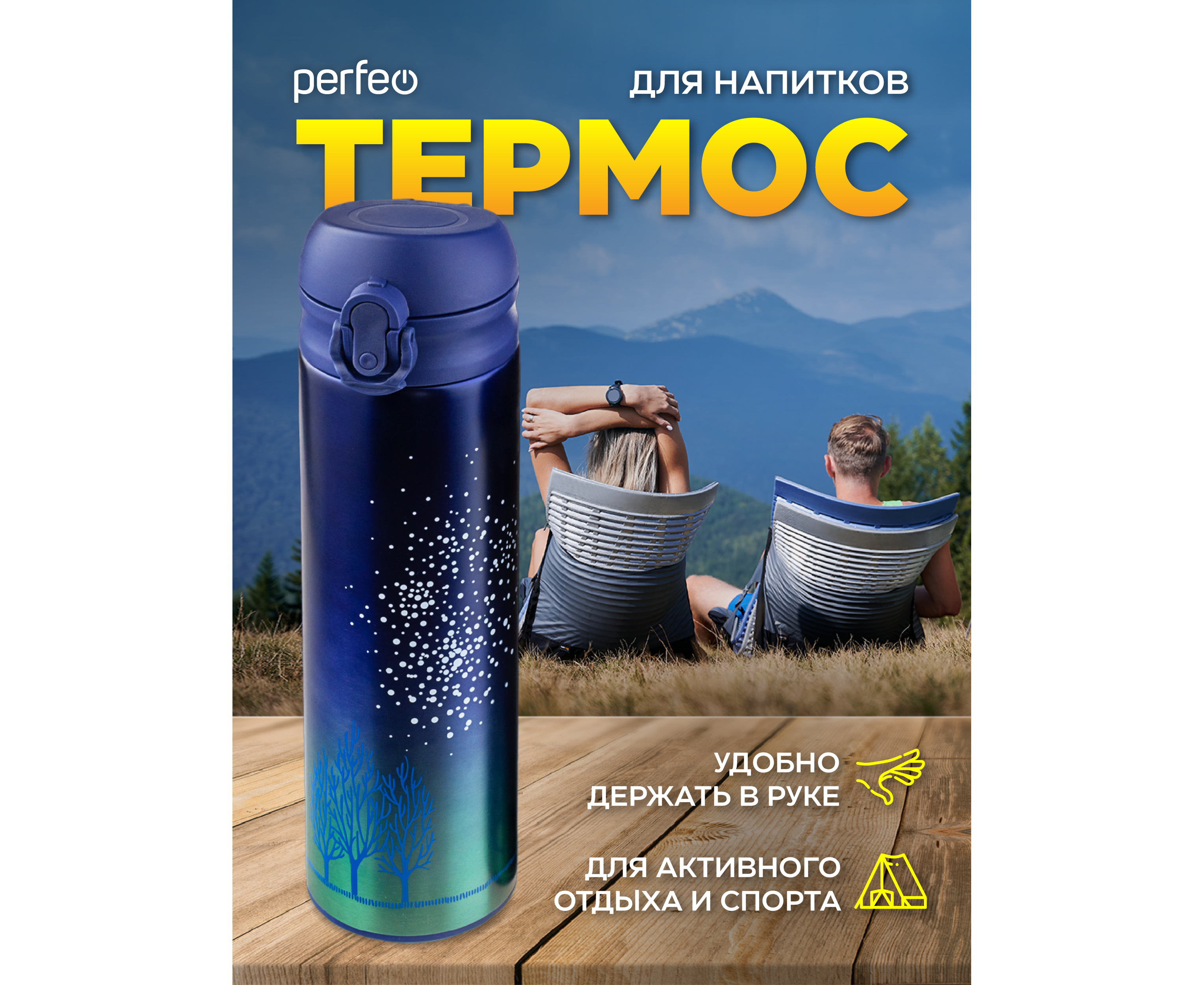 Термос для напитков PERFEO с крышкой-поилкой, ситечком, объем 0,5 л., звездное небо, (Арт. PF_C3714)