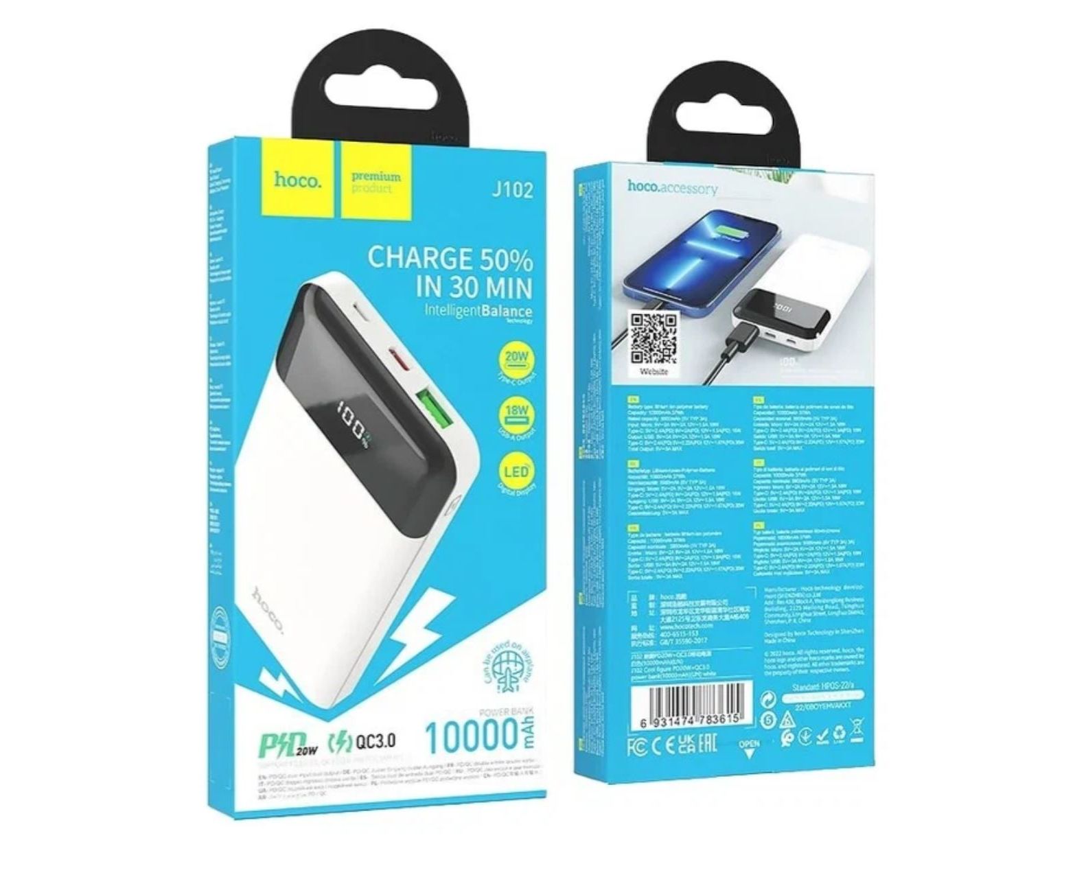 Аккумулятор внешний резервный HOCO J102 10000mAh Cool figure PD20W, QC3.0 (белый)