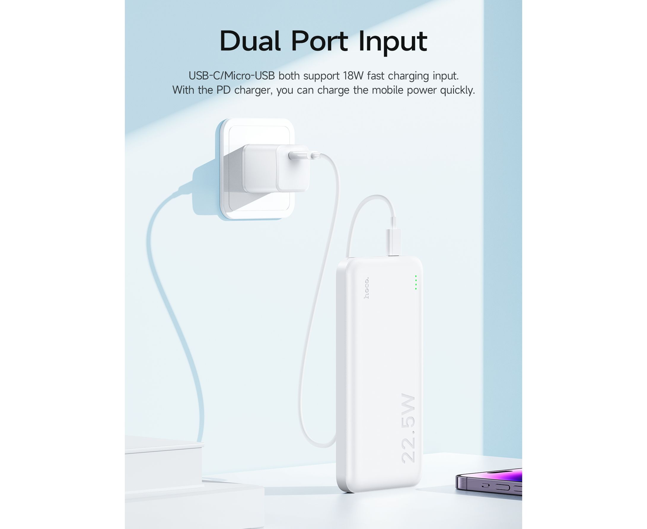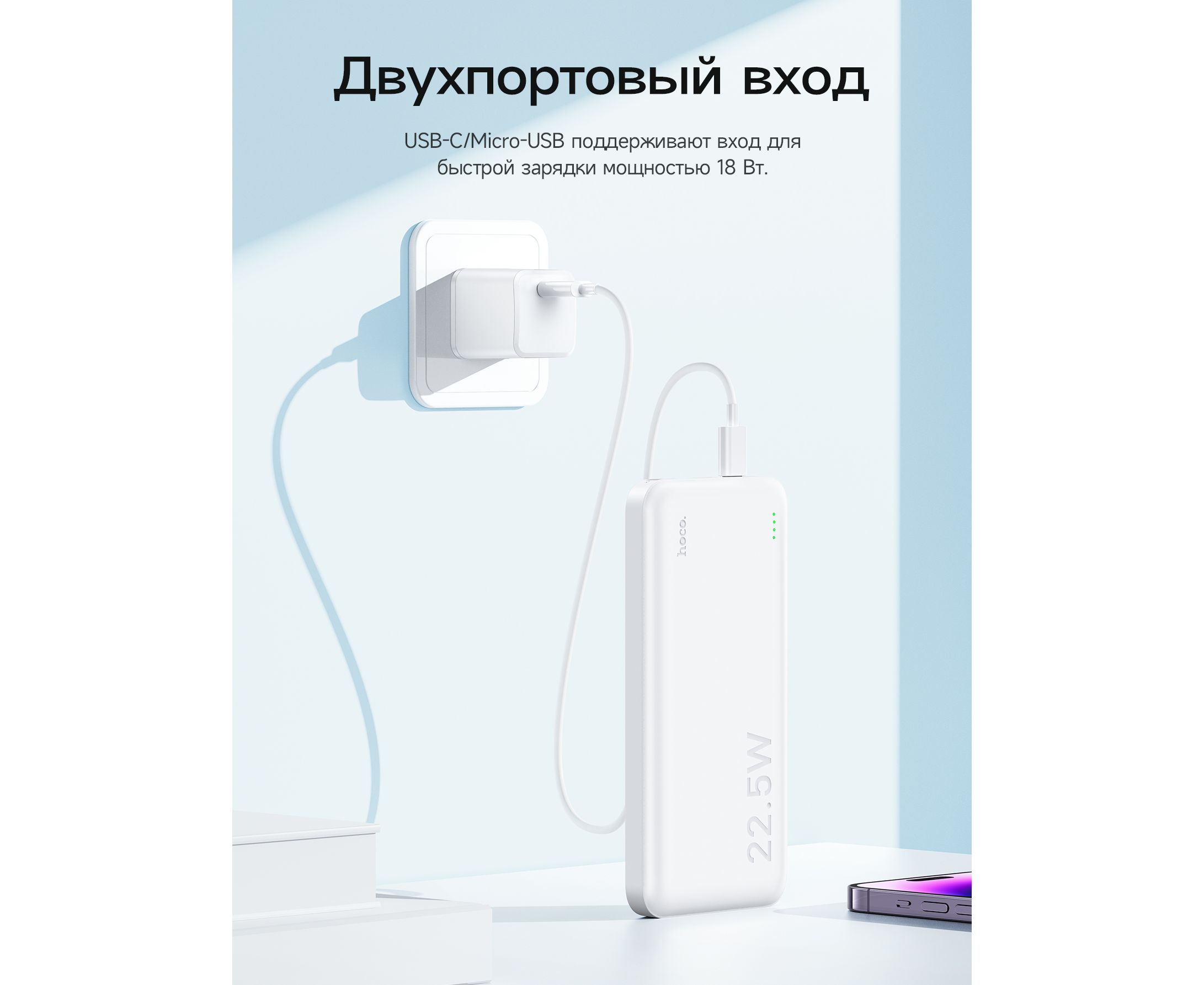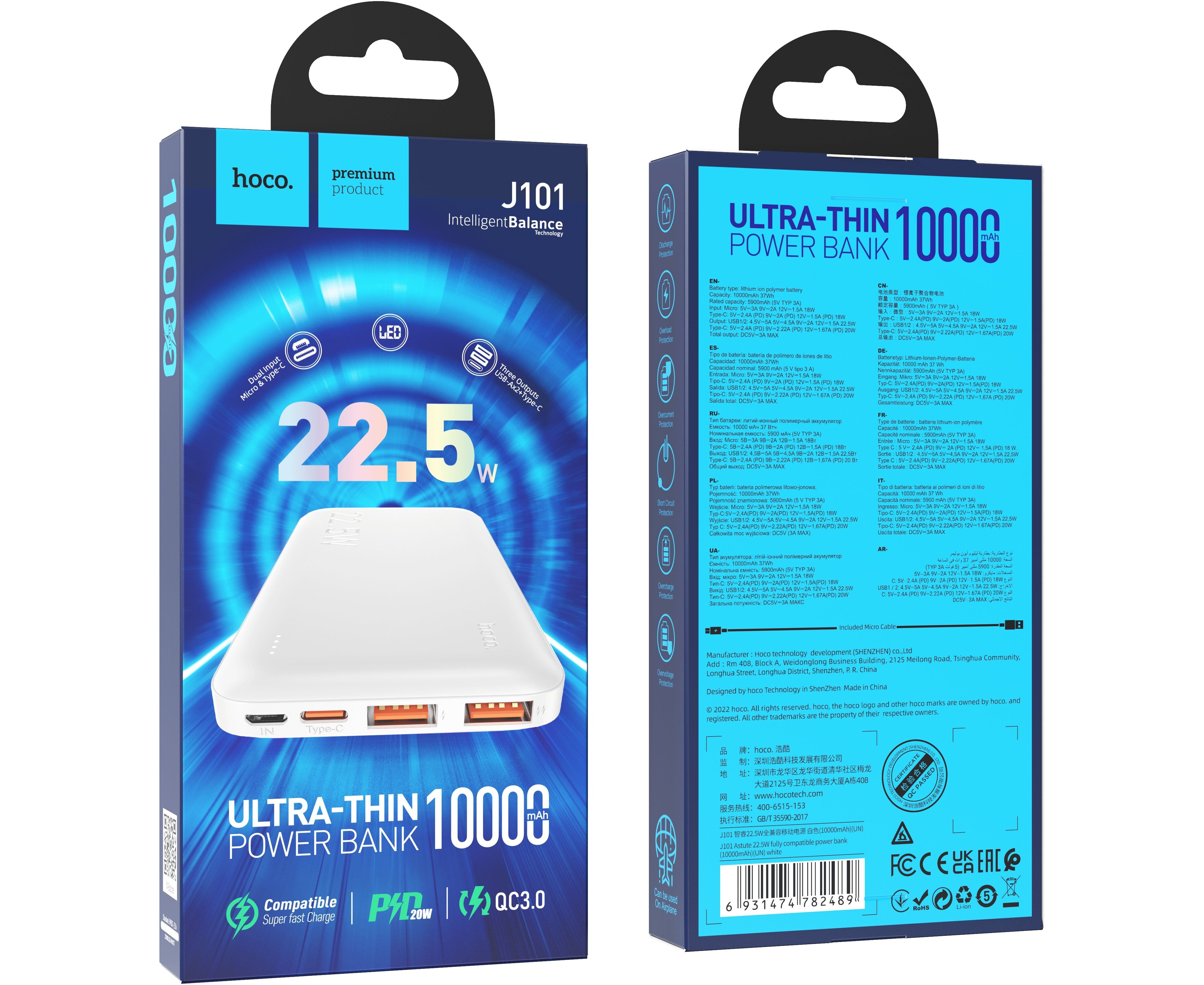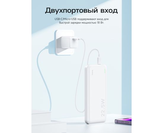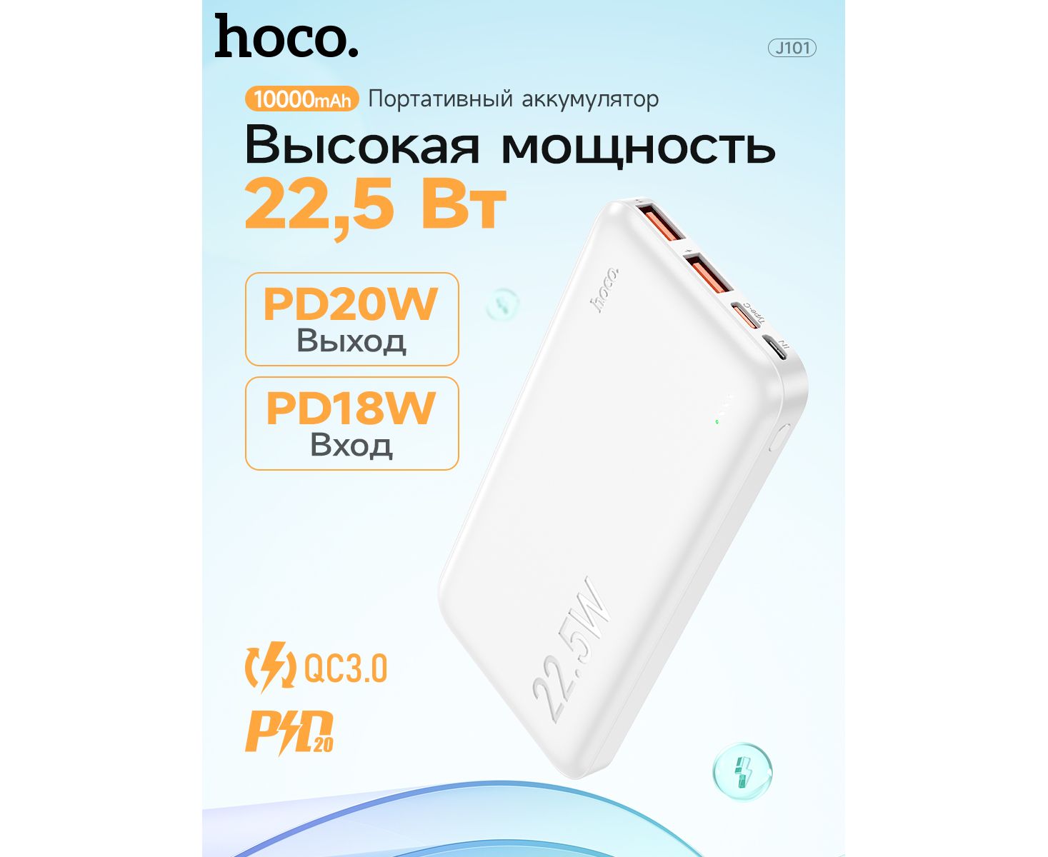 Внешний аккумулятор Hoco J101 Astute с поддержкой стандартов быстрой зарядки (QC/SCP/FCP/AFC). Максимальная выходная мощность - 22.5 Вт. Оснащен 2-мя входными разъемами и 3-мя выходными (порт USB Type C может использоваться как вход, так и выход). PowerBank обладает емкостью в 10000 мАч. Станет отличным помощником для тех, кто любит путешествовать, отдыхать на природе или использует свои мобильные девайсы на полную. В основе батареи лежат качественные элементы питания, благодаря чему удалось достичь высокой надежности и долгого срока службы. Внутренняя многоуровневая система защиты обеспечивает максимально безопасный процесс зарядки и эксплуатации. Текущий уровень оставшегося заряда наглядно отображается при помощи светового индикатора.