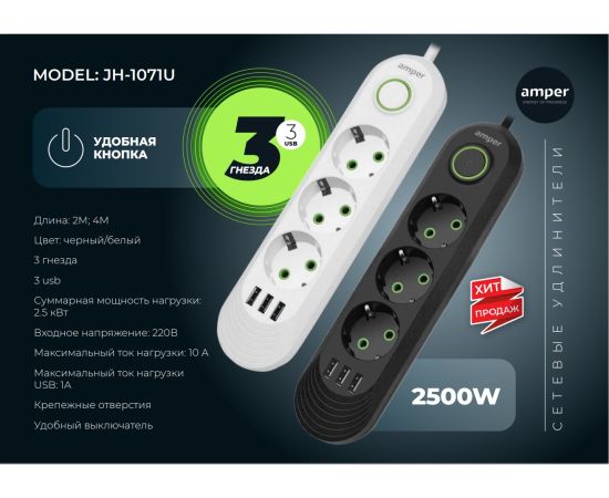 Сетевой удлинитель Amper , 2,0м, 3 розетки, 3*0,75мм, 10А, 2500 Вт, 3usb, черный