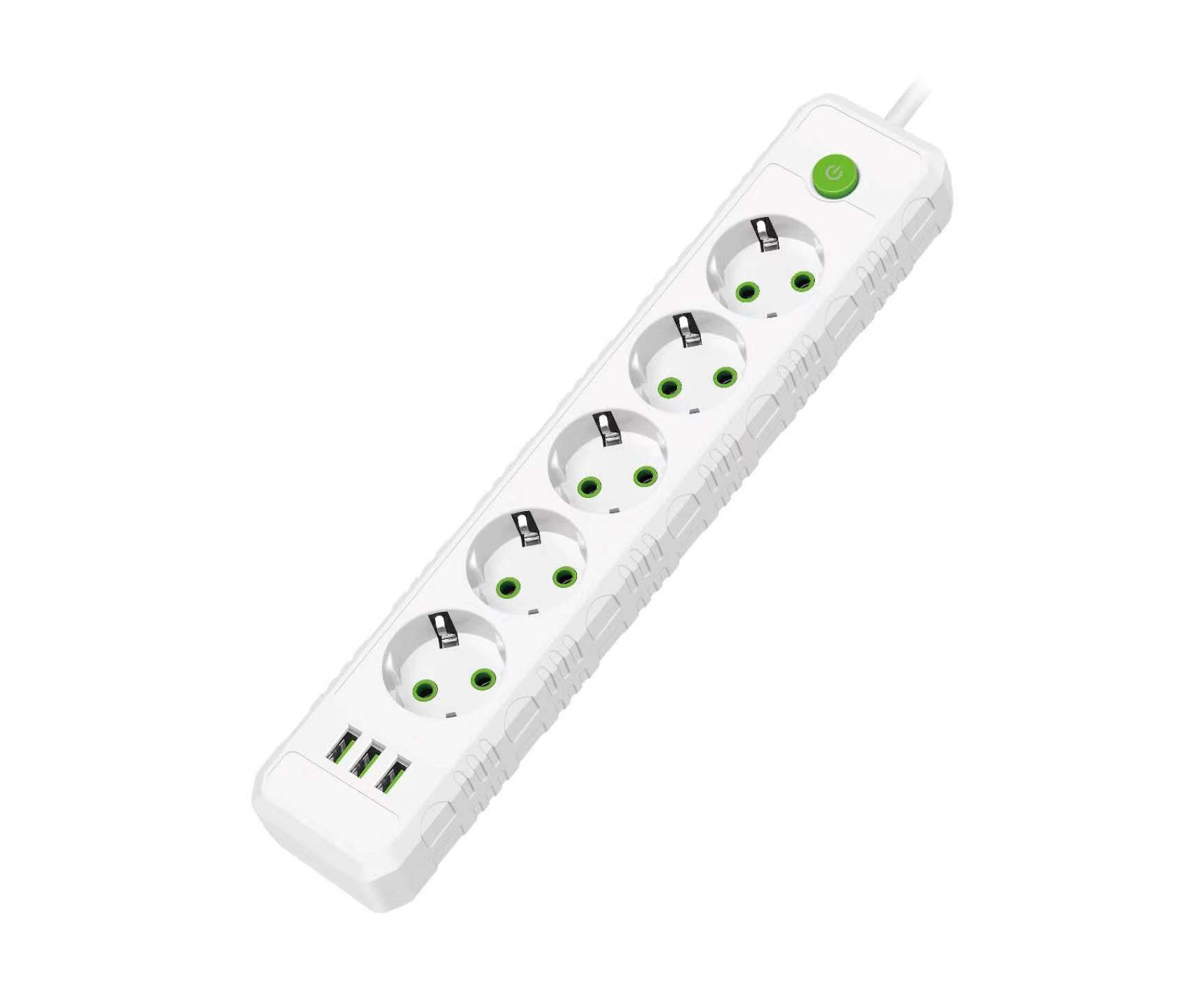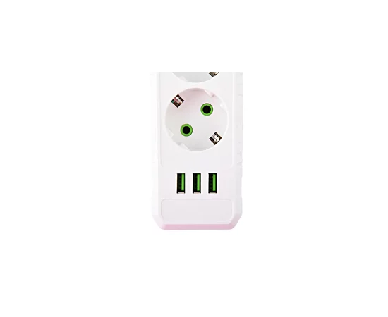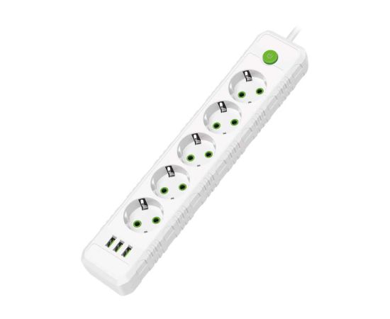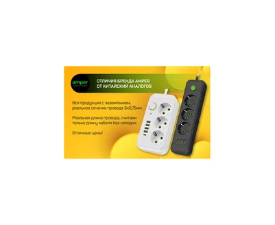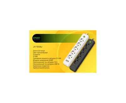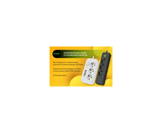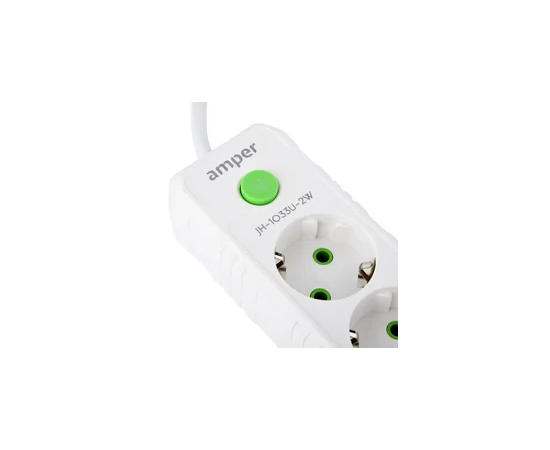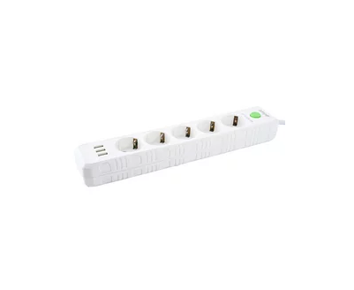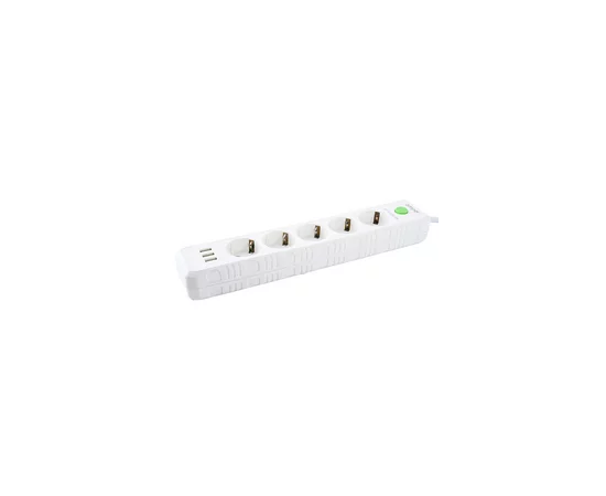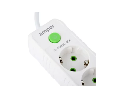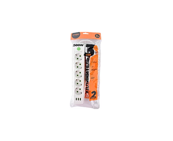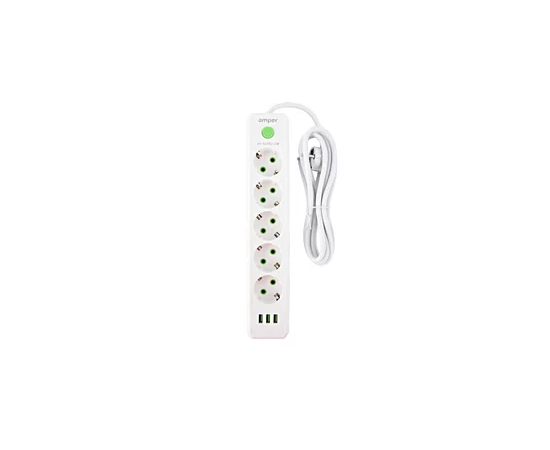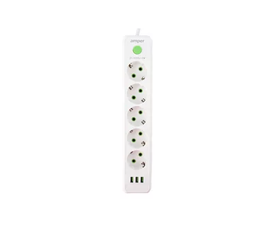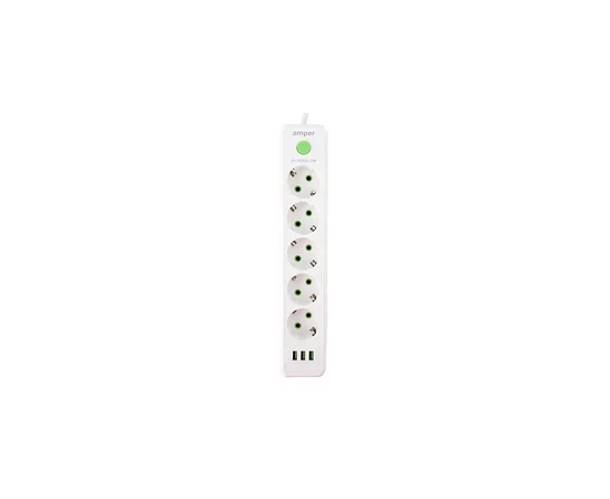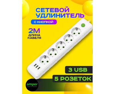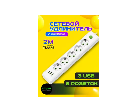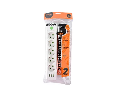 Сетевой удлинитель Amper, 2,0м, 5 розеток, 10А, 2500 Вт, 3usb, белый