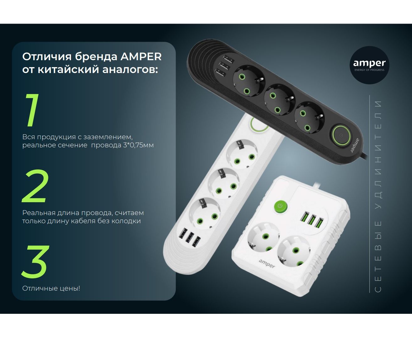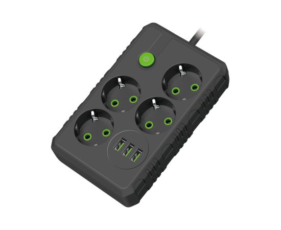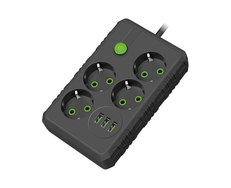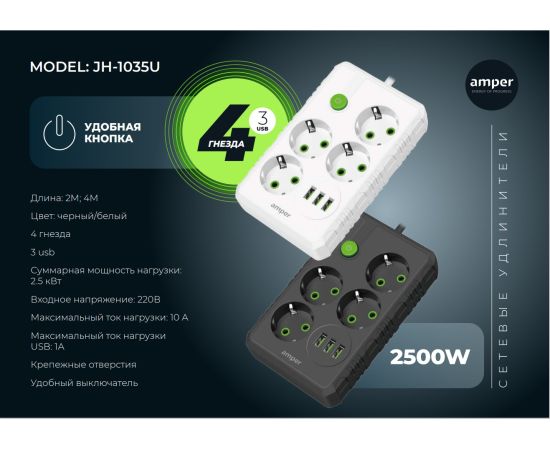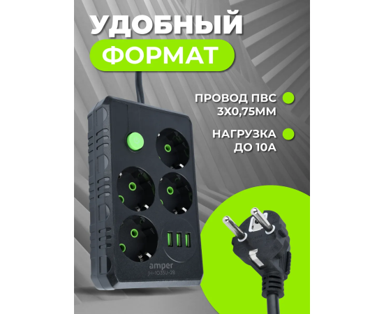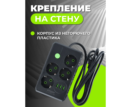 Сетевой удлинитель Amper , 4,0м, 4 розетки, 10А, 2500 Вт, 3usb, черный
