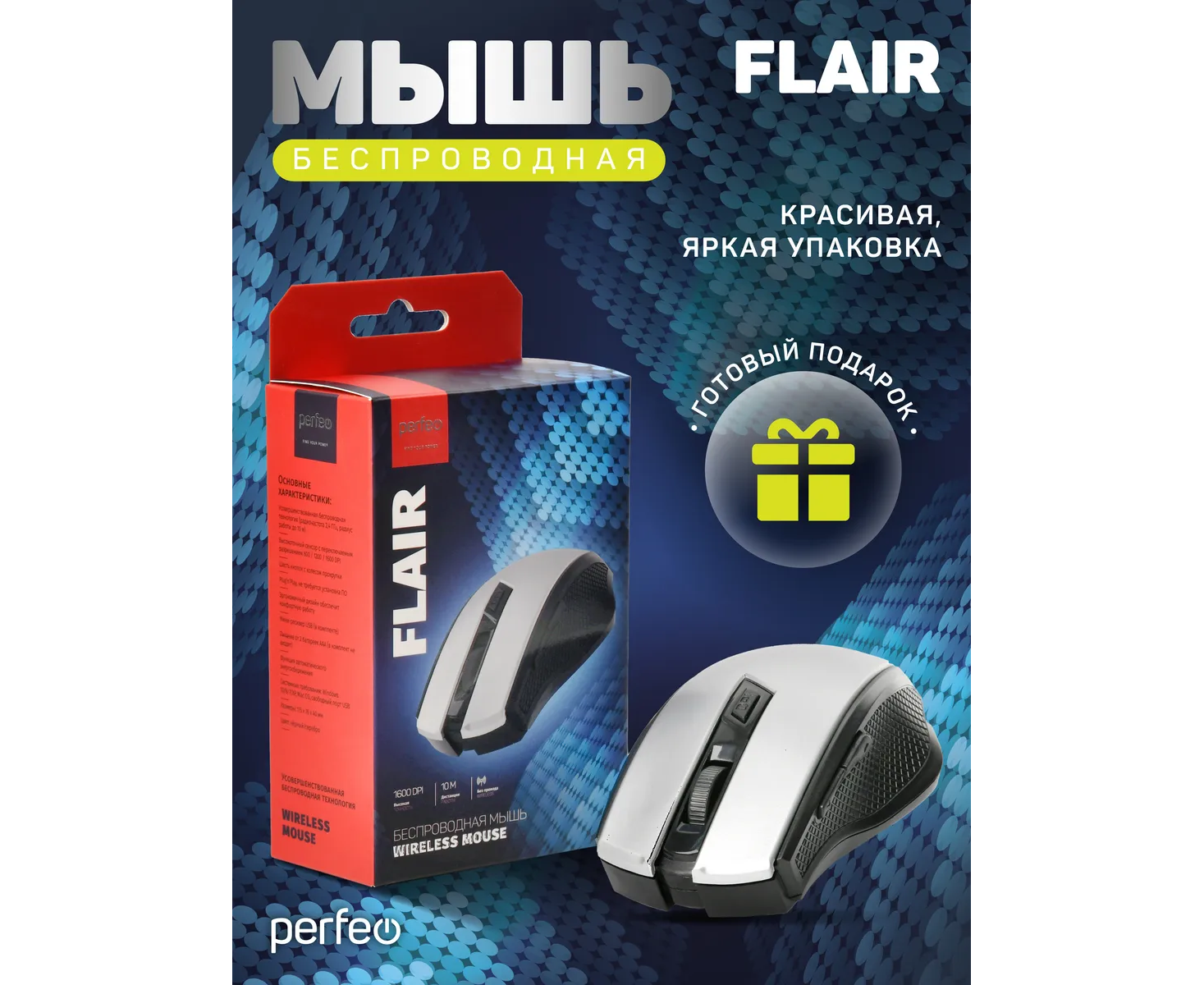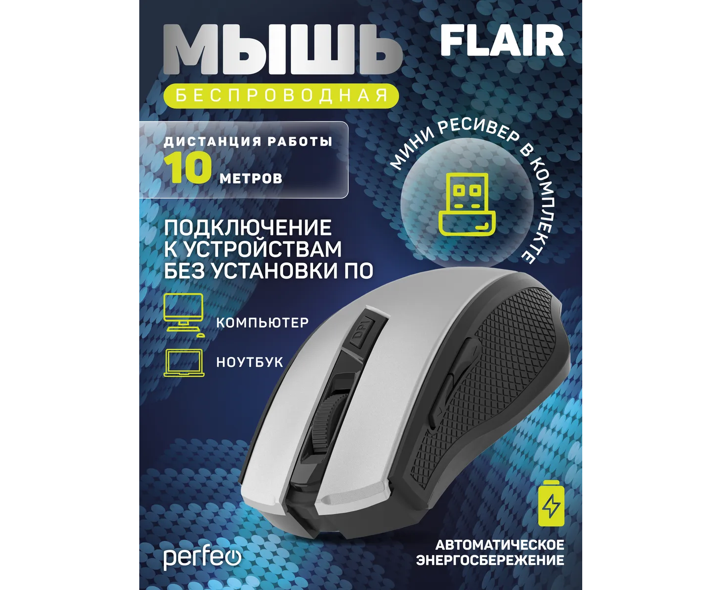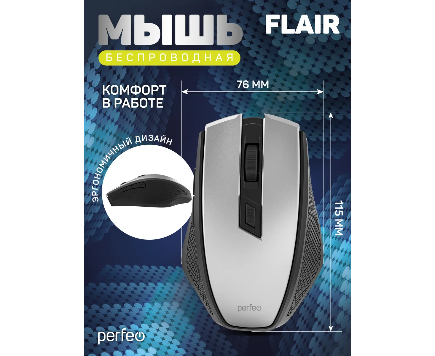 Модель Perfeo мышь беспров., оптич. "FLAIR", 6 кн, 800-1600 DPI, USB, серебро