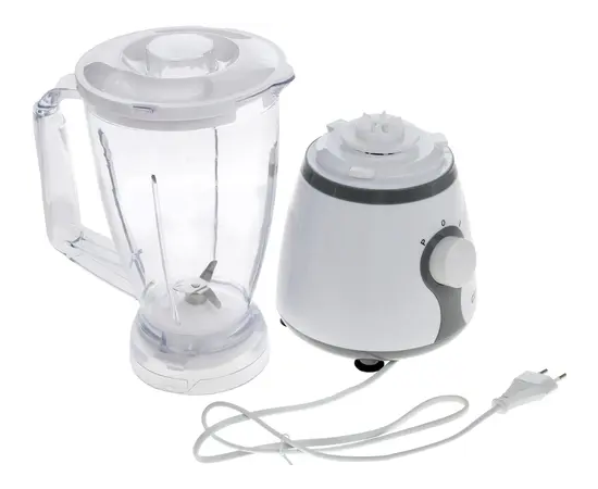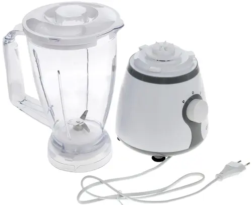 Блендер - стационарная модель с бело-серым корпусом, удобная для приготовления соусов, муссов, пюре, коктейлей и ингредиентов для многих блюд.