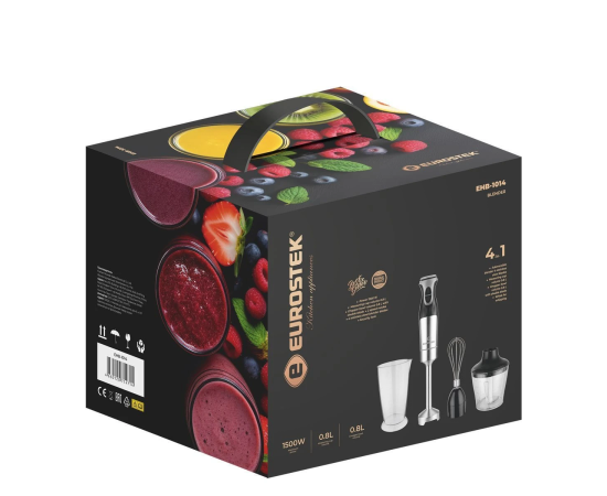 Блендер погружной EHB-1014. Мощность 1500 Вт, низкий уровень шума, 2 скорости, стальной нож, мерный стакан - 800мл, стальной венчик, измельчитель - 800мл