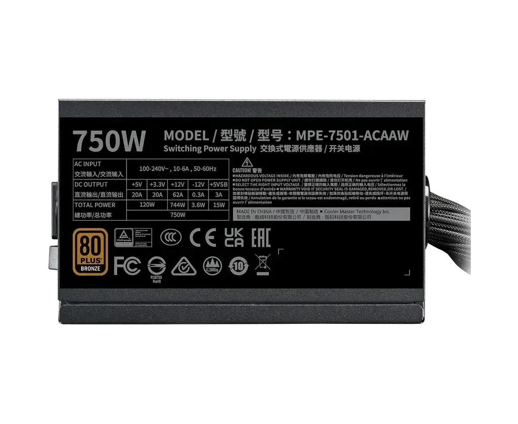Блок питания Cooler Master MWE Bronze V3 Gen.5 (MPE-7501-ACAAW-3BEU), 750Вт, 80 Plus Bronze, 120мм, retail