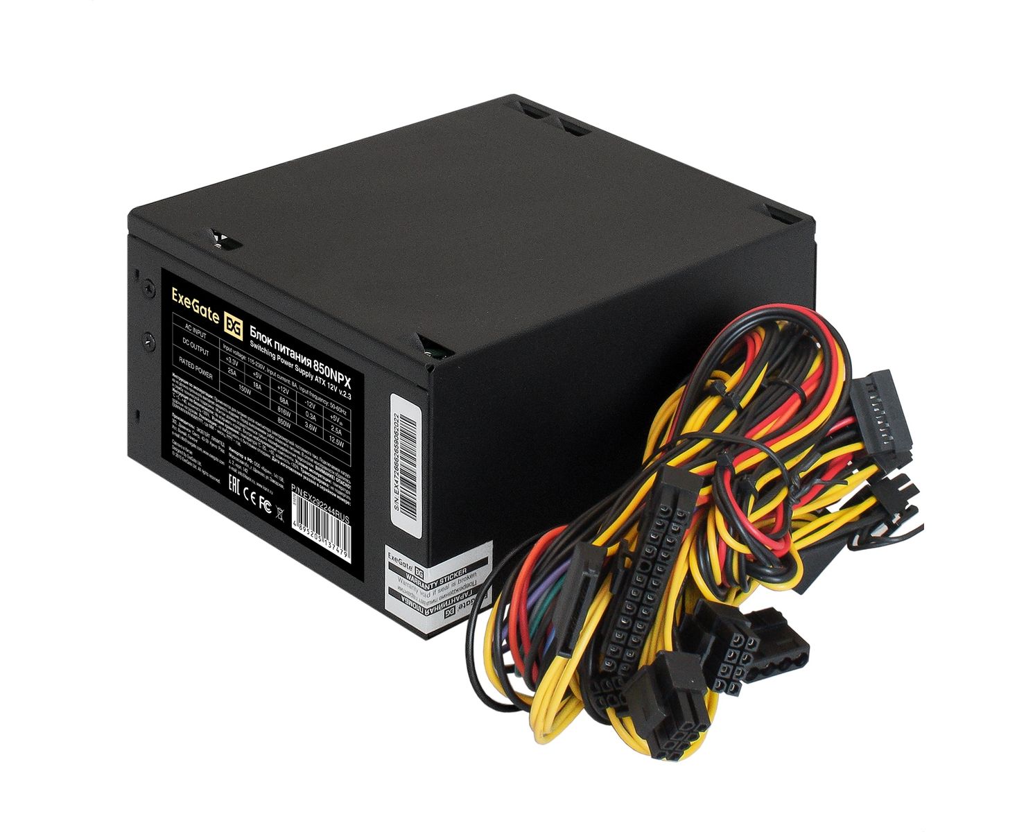 Блок питания ExeGate 850NPX EX292244RUS 850W (ATX, 12cm fan, 24pin, 2x(4+4)pin, 2xPCI-E, 5xSATA, 3xIDE, black)