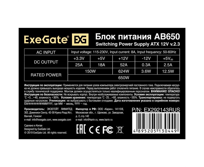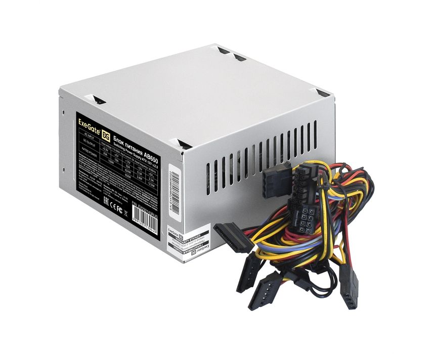 Блок питания ExeGate AB650 EX292143RUS 650W (ATX, 8cm fan, 24pin, 4+4pin, 3xSATA, 2xIDE, FDD)