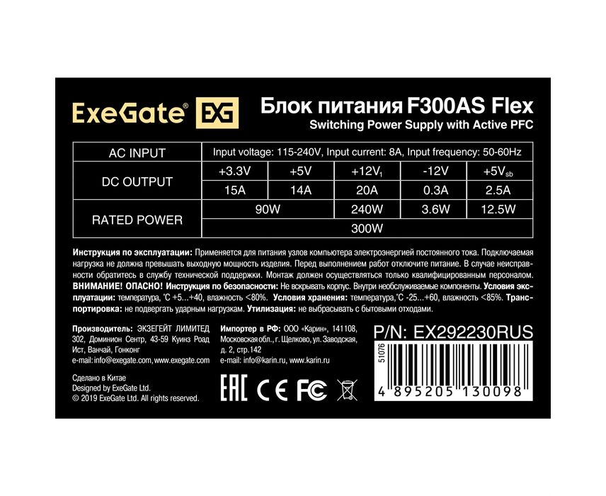 Блок питания ExeGate F300AS EX292230RUS 300W (Flex ATX, for ITX case, APFC, КПД 80% (80 PLUS), 4cm fan, 24pin, 4+4pin, 3xSATA, 2xIDE)