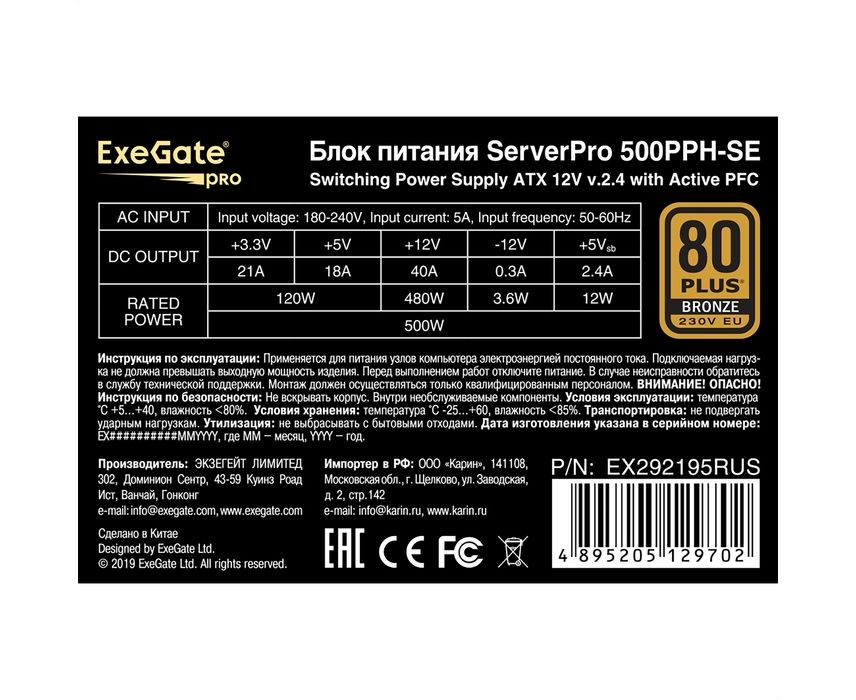 Блок питания ExeGate ServerPRO 80 PLUS® Bronze 500PPH-SE EX292195RUS 500W (ATX, for 3U+ cases, APFC, КПД 89% (80 PLUS Bronze), 12cm fan