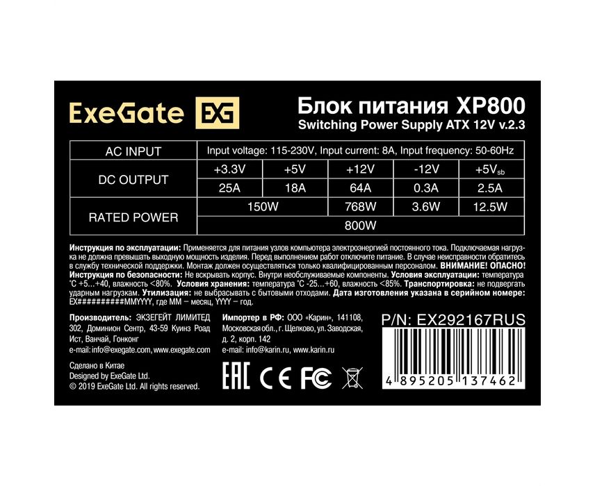 Блок питания ExeGate XP800 EX292167RUS 800W (ATX, 12cm fan, 24pin, 2x(4+4)pin, 2xPCI-E, 5xSATA, 3xIDE, black)