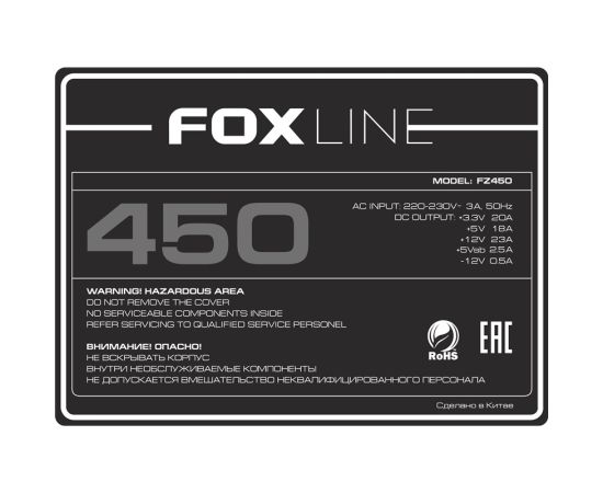 Блок питания Foxline FZ450 Power Supply 450W, ATX, NOPFC, 80FAN, 2xSATA, 1xFDD, 24+4