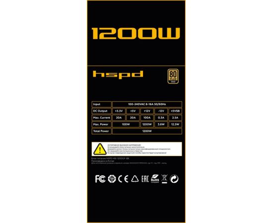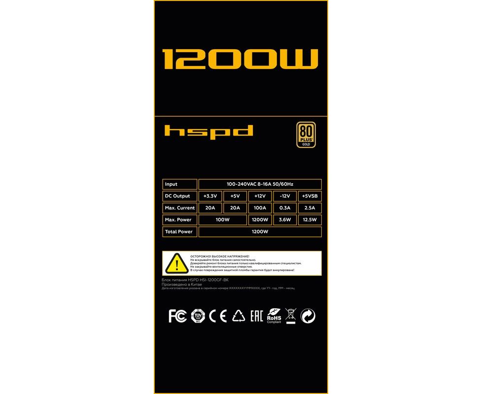 Блок питания HSPD HSI-1200GF-BK 1200W 80+ Gold (ATX, 3.1, PCIe 5.1, Full modular, 1x24(20+4)pin 600mm, 2xCPU 8(4+4)pin 700mm, 2xPCIe*2