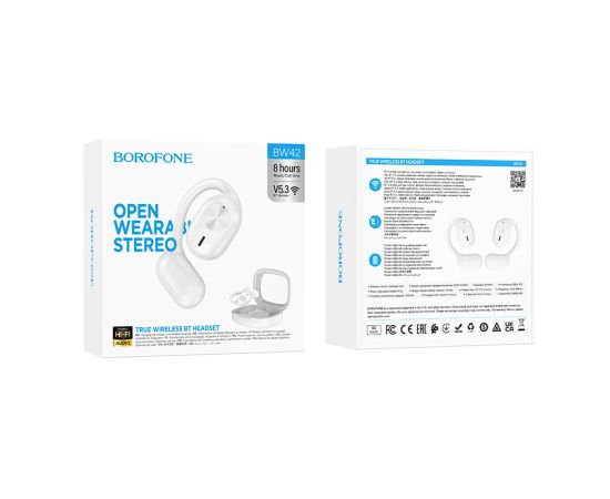 Беспроводные наушники Borofone BW42 TWS с креплением за ухом - современные наушники, которые обеспечат вам отличное качество звука и надежную фиксацию во время активных занятий и спортивных тренировок. Благодаря конструктивному решению крепления, их невозможно стряхнуть или потерять во время бега или тренировки. Наушники оснащены встроенным микрофоном, позволяющим совершать звонки и вести разговоры без необходимости снимать наушники. Они совместимы с ПК, ноутбуками, телефонами и планшетами, поддерживающими функцию Bluetooth 5.3. Емкость аккумулятора обеспечивает время работы в режиме активного использования в течение 8 часов, а в режиме ожидания до 180 часов. Они маленькие, легкие и удобные, что делает их идеальным выбором для длительной работы или развлечений. Выполнены в двух цветах.
