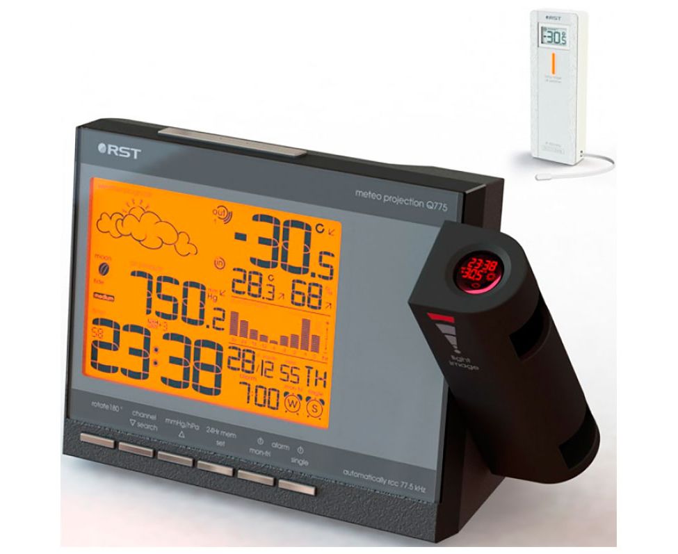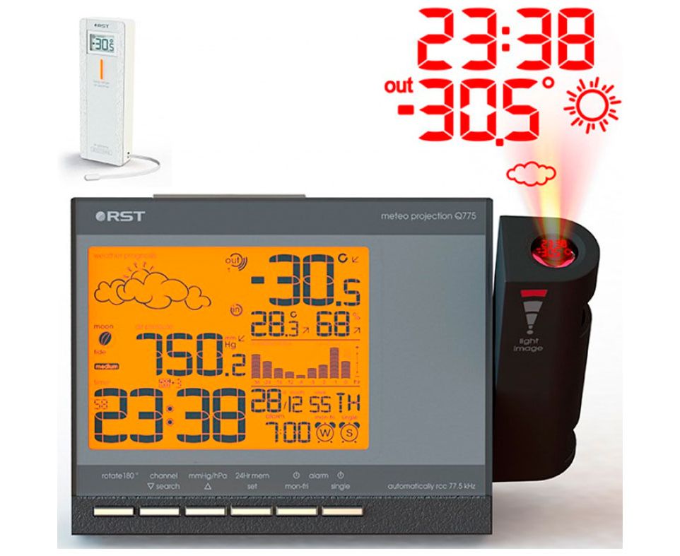 Проекционные часы-метеостанция получают данные о внешней температуре от дистанционного радиодатчика RST02252. Яркая регулируемая в повороте и направлении проекция времени, прогноза погоды, внутренней и внешней температуры на стену или потолок. Точное время и дата синхронизируются с сигналами точного времени rcc 77,5*. календарь с указанием дня недели. Прогноз погоды, цифровой барометр, график изменения атмосферного давления, анимированный лунный календарь с силой приливов и отливов, температура и относительная влажность внутри помещения, внешняя температура, тенденция изменения всех параметров, температуры отображаются в градусах Цельсия, автоматическое запоминание максимального и минимального зарегистрированных значений температур, индикатор состояния батареек базовой станции, возможность работы без элементов питания, в этом случае необходимо подключить сетевой адаптер. Приятная мягкая оранжевая подсветка дисплея.
