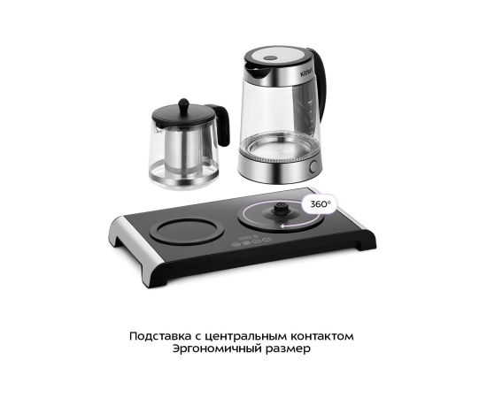 Чайный набор КТ-6743 состоит из чайника, заварочного чайника с фильтром и базы. Набор позволяет не только вскипятить воду, но и заварить чай или кофе, а также сохранить готовый напиток тёплым в течение 4 часов за счёт платформы с подогревом.