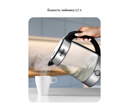 Внешняя часть корпуса чайника выполнена из пластика и нержавеющей стали, а внутренняя — из стекла. Переключатель расположен под ручкой чайника. При включении загораются индикатор и подсветка внутри корпуса. Максимальная ёмкость чайника 1,7 литра.