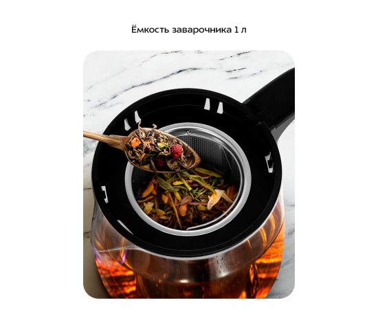 Заварочный чайник изготовлен из термостойкого стекла и имеет съёмный фильтр из нержавеющей стали для чая или кофе. В месте установки заварочного чайника на базе находится платформа с подогревом, которая сохранит напиток тёплым в течение 4 часов.