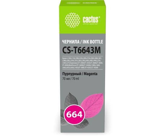 Чернила Cactus CS-T6643M 664 пурпурный 70мл для Epson L130,L110,L100,L220,L200,L310,L300,L360,L361,L380,L382,L350,L355,L365,L395,L405,L485,L495,L555,L565,L575,Expression ET-2500,ET-2550,ET-2600,ET-2650,ET-4500;WorkForce ET-14000,ET-16500;L1300,L1400,L605,L655,L656,L1455;ET-3600, ET-4550, ET-16500