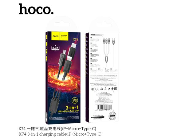 Дата-кабель HOCO X74 3-in-1 charging cable, iP, Micro, Type-C (чёрный)