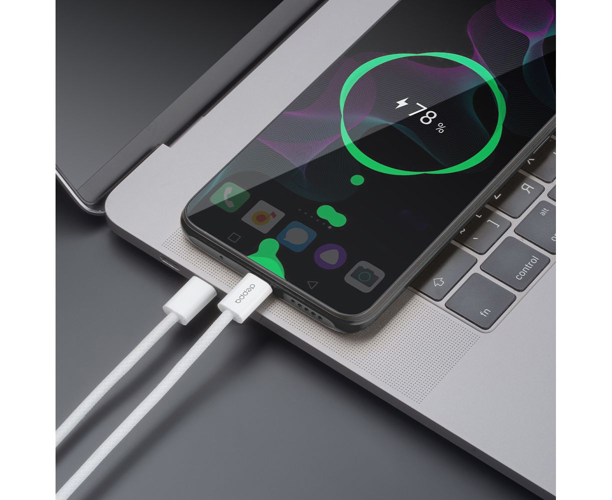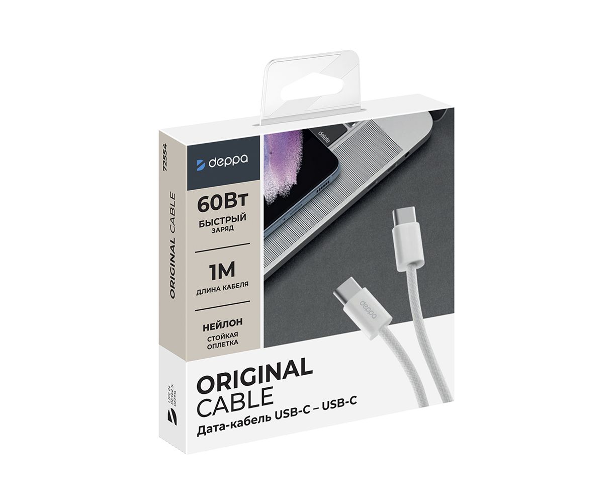 Дата-кабель Original, USB-C - USB-C, 60Вт, 1м, нейлон, белый, Deppa