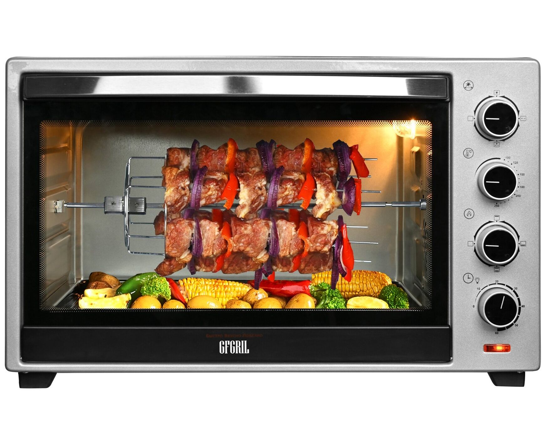 Мини-печь Gfgril GFO-60 мощностью 2000 Вт легко заменит духовку. В комплекте идут ухват, вертел, подставка для пиццы, решетка, плоский противень. Есть режимы конвекции и гриля.
