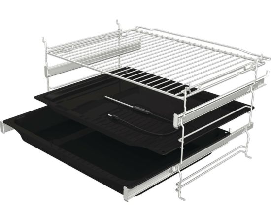 частично выдвижные телескопические направляющие на 2-х уровнях, глубокий эмалированный противень, мелкий эмалированный противень, решетка, термозонд для мяса