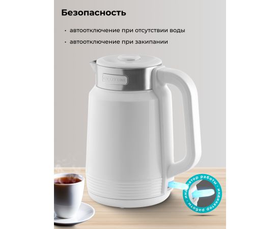 сохраняя воду горячей долгое время. Об этот чайник невозможно обжечься, его не нужно часто подогревать, что обеспечивает безопасность и экономию электроэнергии.