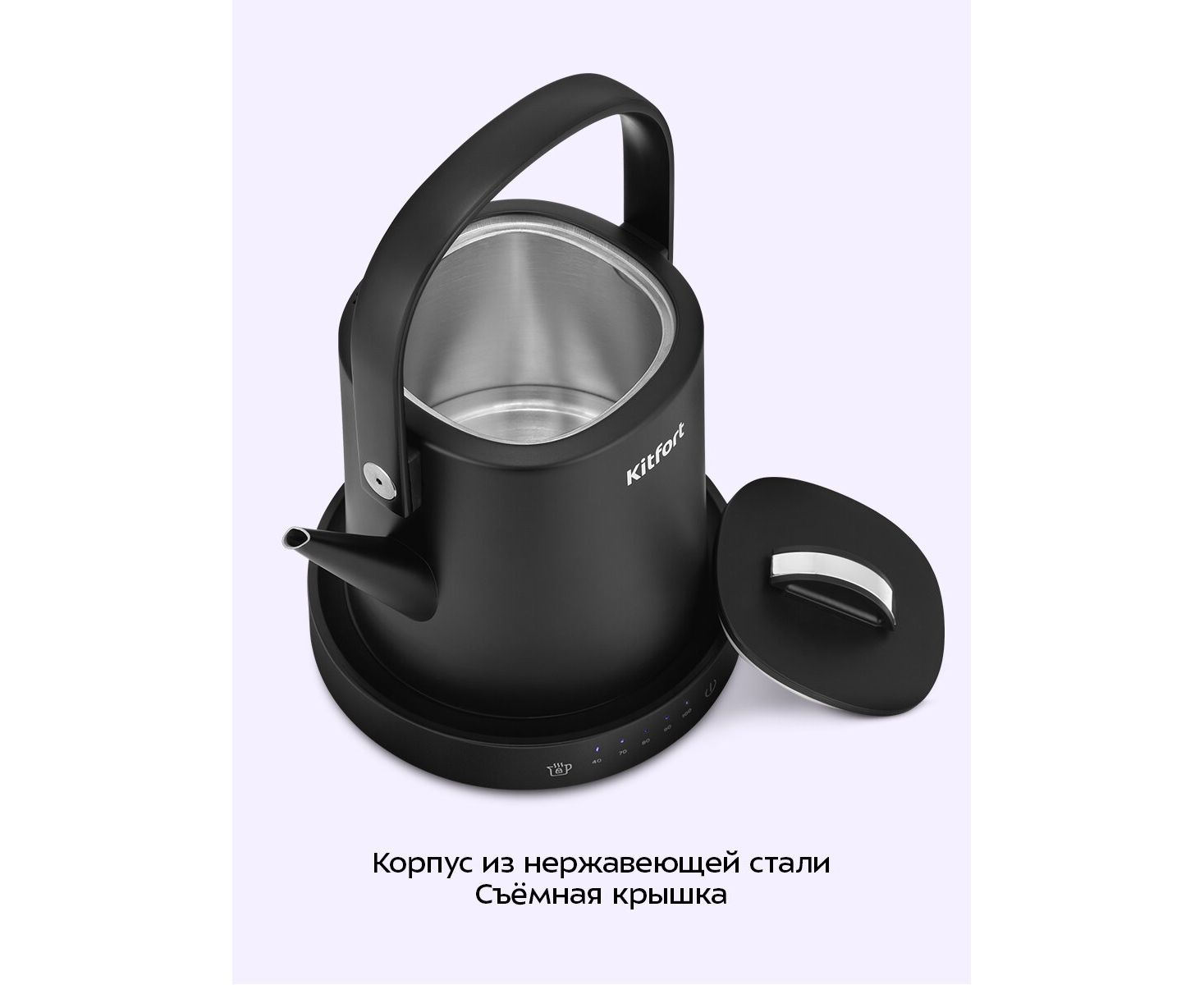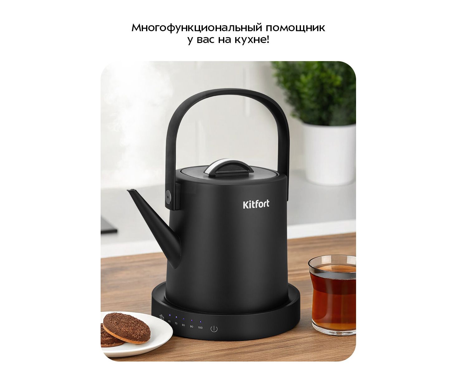 Электрический чайник может не только вскипятить воду, но и нагреть ее до температур: 40, 70, 80 и 90 °С‚ что очень удобно при заваривании различных сортов чая, детского питания и т.д. Чайник также оснащён функцией поддержания температуры.