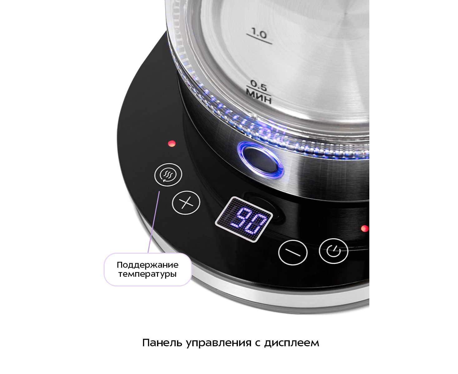 На подставке расположена панель управления чайником. Помимо функции контроля температуры, чайник оснащён функцией её поддержания, которое длится 4 часа. Температура воды контролируется встроенным в дно чайника термодатчиком.