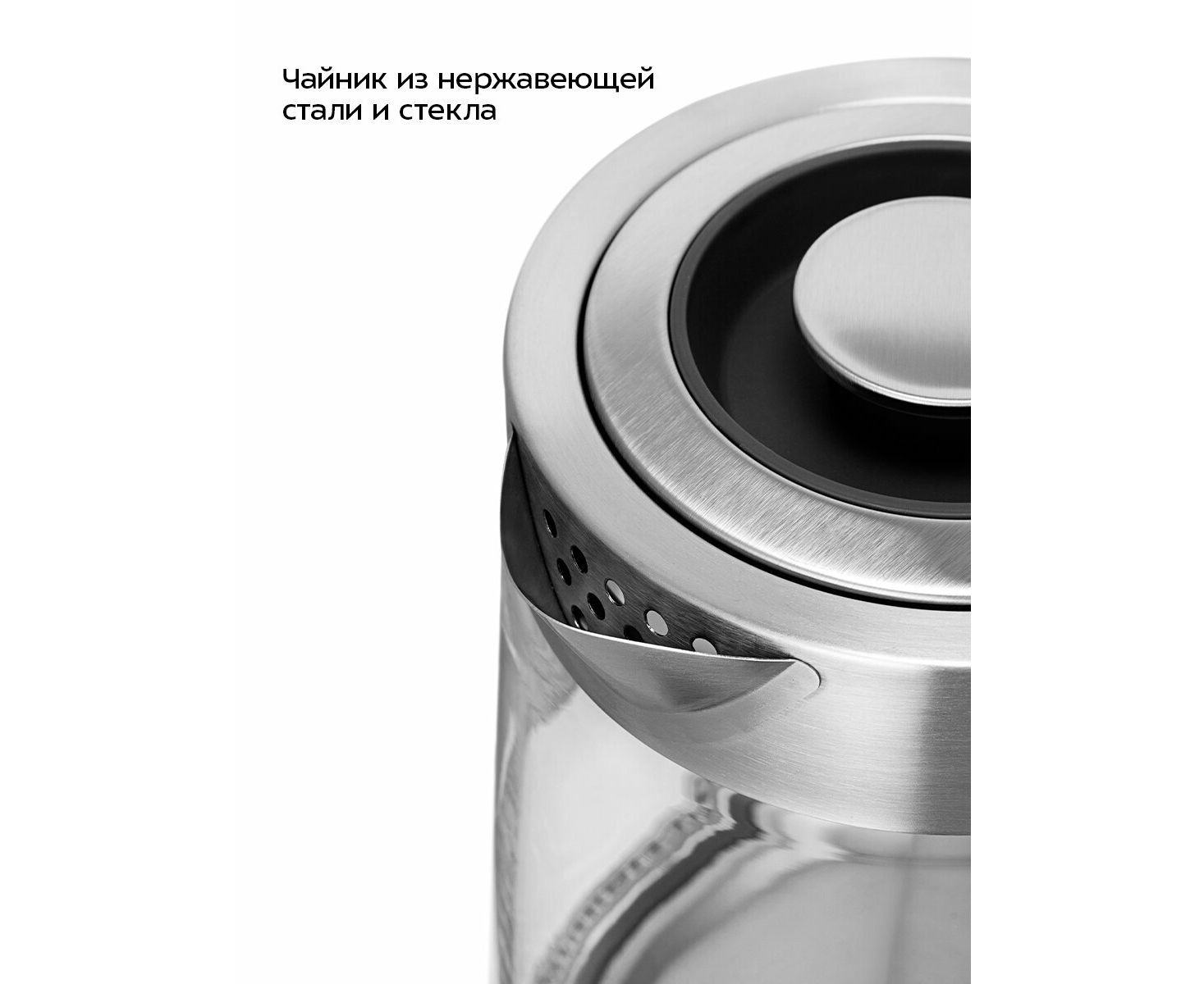 Чайник выполнен из нержавеющей стали и стекла. Мерная шкала нанесена на прозрачную стеклянную часть корпуса. Съёмная крышка и большое горлышко чайника облегчают доступ внутрь при мытье.