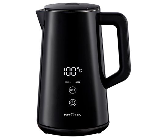 KRONA Digitaler Black - этот стильный и современный электрочайник сочетает в себе все преимущества инновационных технологий и надежной функциональности. Цифровое сенсорное управление предоставляет полный контроль над процессом нагрева. LED дисплей вровень с корпусом информирует о текущей температуре воды, а двойные стенки корпуса сохраняют тепло дольше. Емкость 1,5 литра идеально подходит для домашнего использования. Чайник оснащен гибкой регулировкой температурного режима от 40°C до 100°C, что позволяет выбрать оптимальный режим нагрева для различных напитков. Тройная защита предотвращает сухое кипячение, чайник отключается при снятии и автоматически выключается при закипании. Встроенный фильтр защиты от пыли и накипи, сохраняет воду чистой