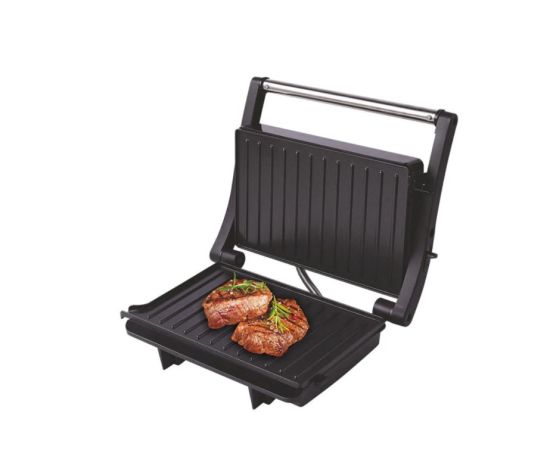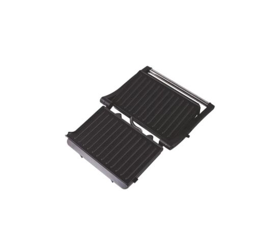 2 рифленые панели для жарки, размер панели 23.1х14.6 см, антипригарное покрытие, открытие панелей на 180° (возможность приготовления на 2 пластинах одновременно), индикатор работы, прорезин. ножки. Корпус из нержавеющей стали и термостойкого пластика.