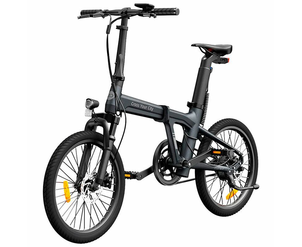 Электровелосипед ADO A20S Lite с амортизационной вилкой, карбоновым ремнем и аккумулятором Samsung для комфортных городских поездок.