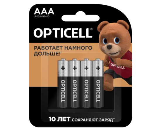 Батарейки базовой линейки Opticell размера AAA — работают до 15 раз дольше* (*по сравнению с солевой батарейкой типа ААA. Результаты могут варьироваться в зависимости от устройства и интенсивности использования). Защита от протекания. Не содержит тяжелых металлов. Возможность полной переработки. Срок хранения до 10 лет** (**сохраненяет заряд пока батарейка не используется при нормальных условиях хранения).