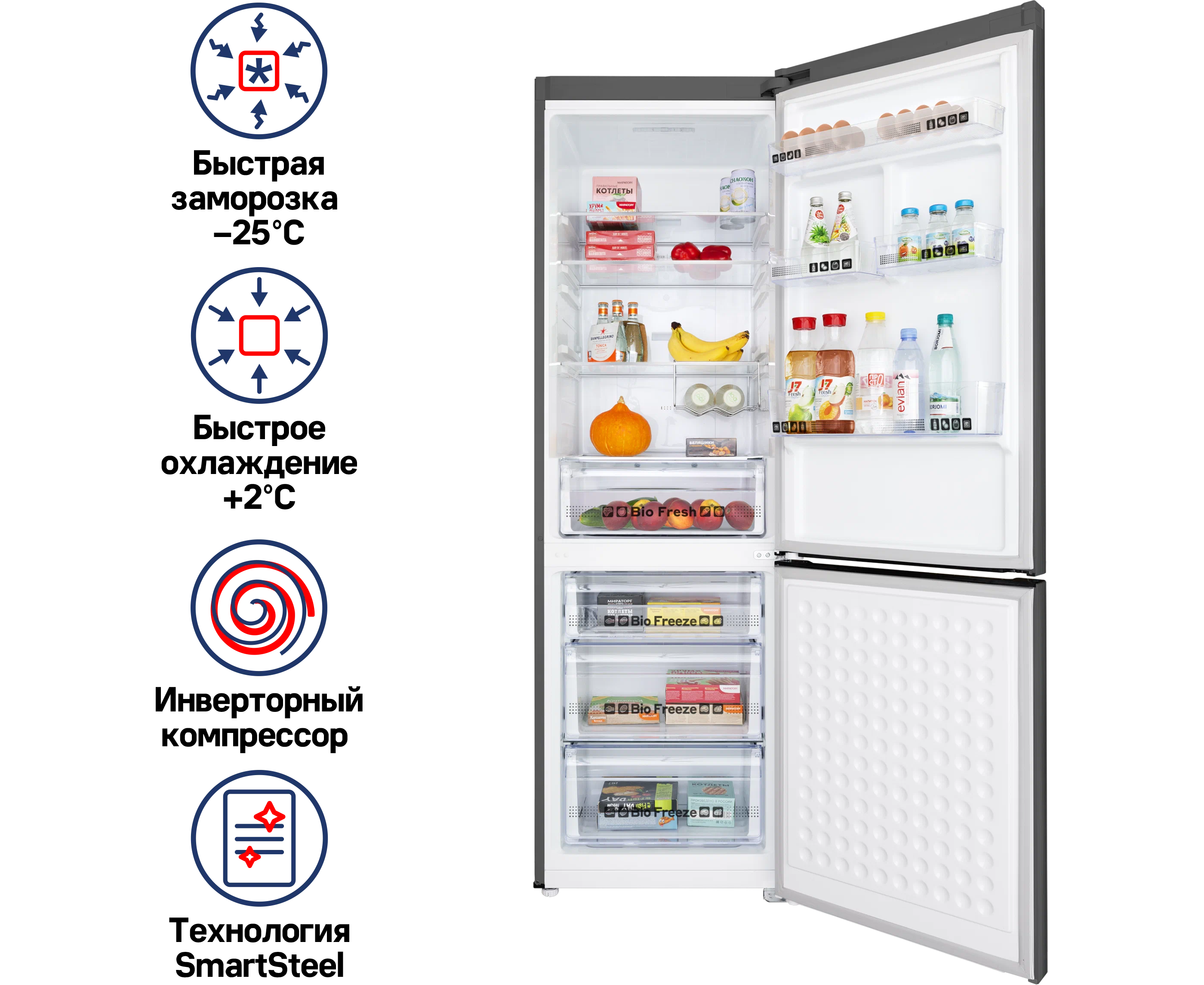 Full No Frost, Антибактериальное покрытие камеры, Дисплей, Светодиодная подсветка, Скрытые ручки, Суперзаморозка, Суперохлаждение