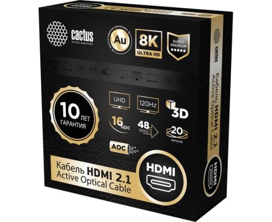Кабель аудио-видео Cactus CS-HDMI-AOC-2.1-20, HDMI(m)-HDMI(m) ver 2.1, 20м, Gold, черный