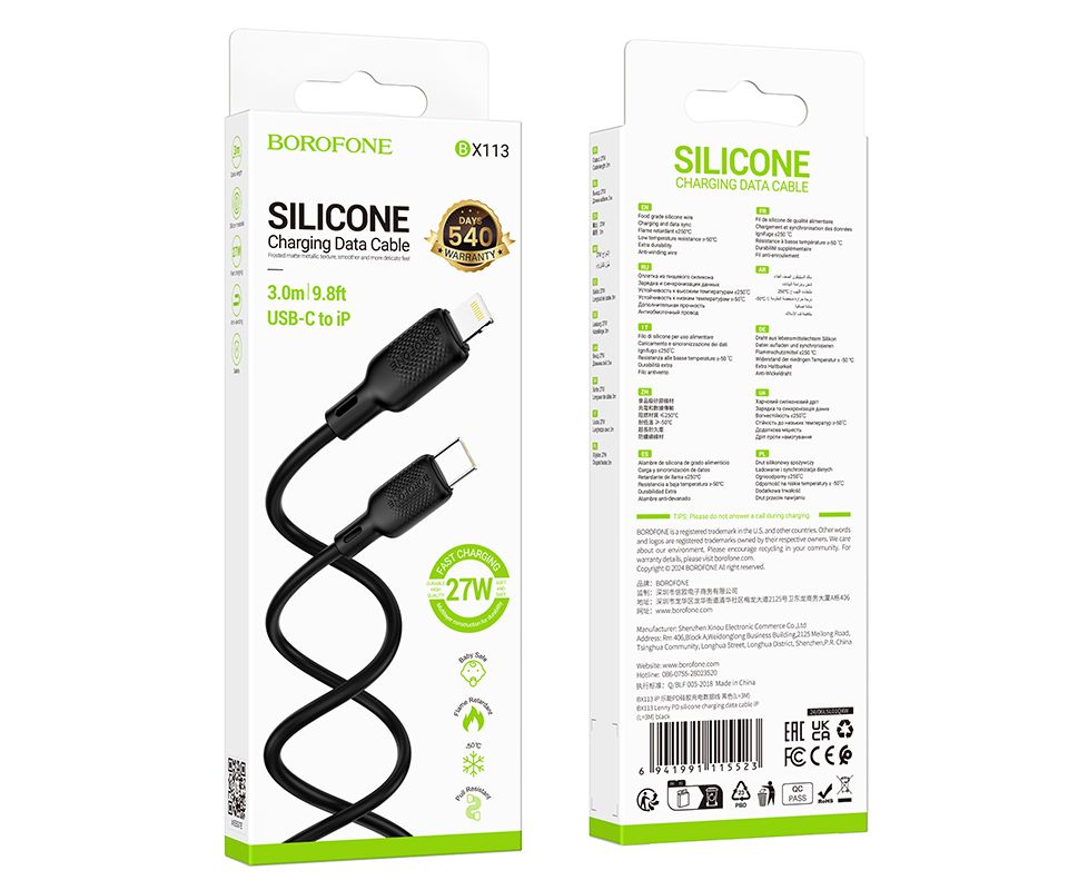 Кабель BOROFONE BX113 Lenny PD silicone charging data cable IP (L-3M) Black