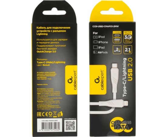 Кабель CABLEXPERT CCB-USB2-CMAPO1-2MW USB2.0 Type-C-Lightning, 2м 2.1 А, 20Вт, PD, медь, белый