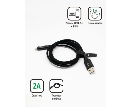 Дата-кабель с возможностью быстрой зарядки в оплётке со стяжкой USB 2.0 (M) - 8-Pin (M), Сила тока: 2A. 1м. Черный.