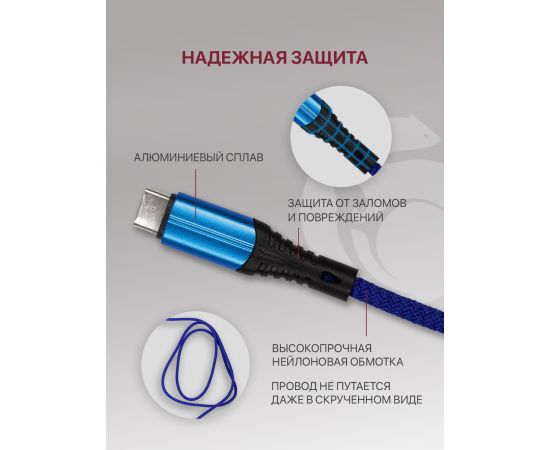 Кабель Type-C-USB для быстрой зарядки и передачи данных (2.1A) нейлоновый, синий (1м)