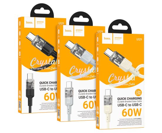 U129 Spirit, Type-C на Type-C зарядный дата кабель, поддержка быстрой зарядки PD 60W, нейлоновая оплётка, длина – 1.2м