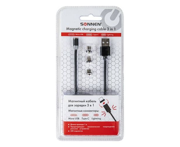 Магнитный кабель SONNEN для зарядки 3в1 USB 2.0-Micro USB/Type-C/Ligtning, 1м, черный 513561 предназначен для зарядки любого типа устройств. Компактный, портативный шнур, который удобно брать с собой.