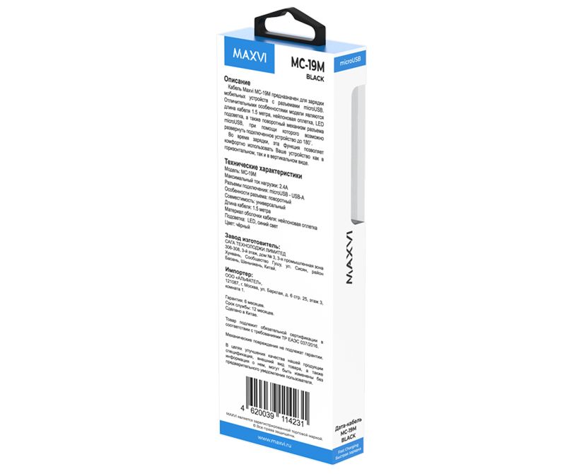 Кабель Maxvi MC-19M black, USB-A-microUSB, 2.4A, LED