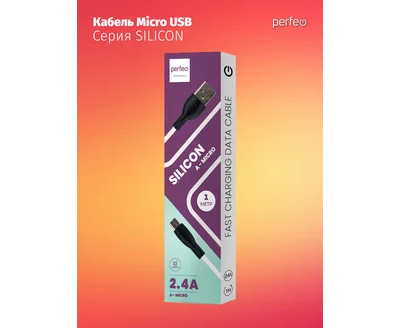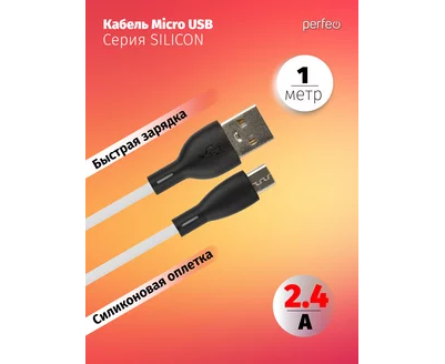 Кабель PERFEO USB A вилка - Micro USB вилка, 2.4A, белый, силикон, длина 1 м., SILICON (U4026)